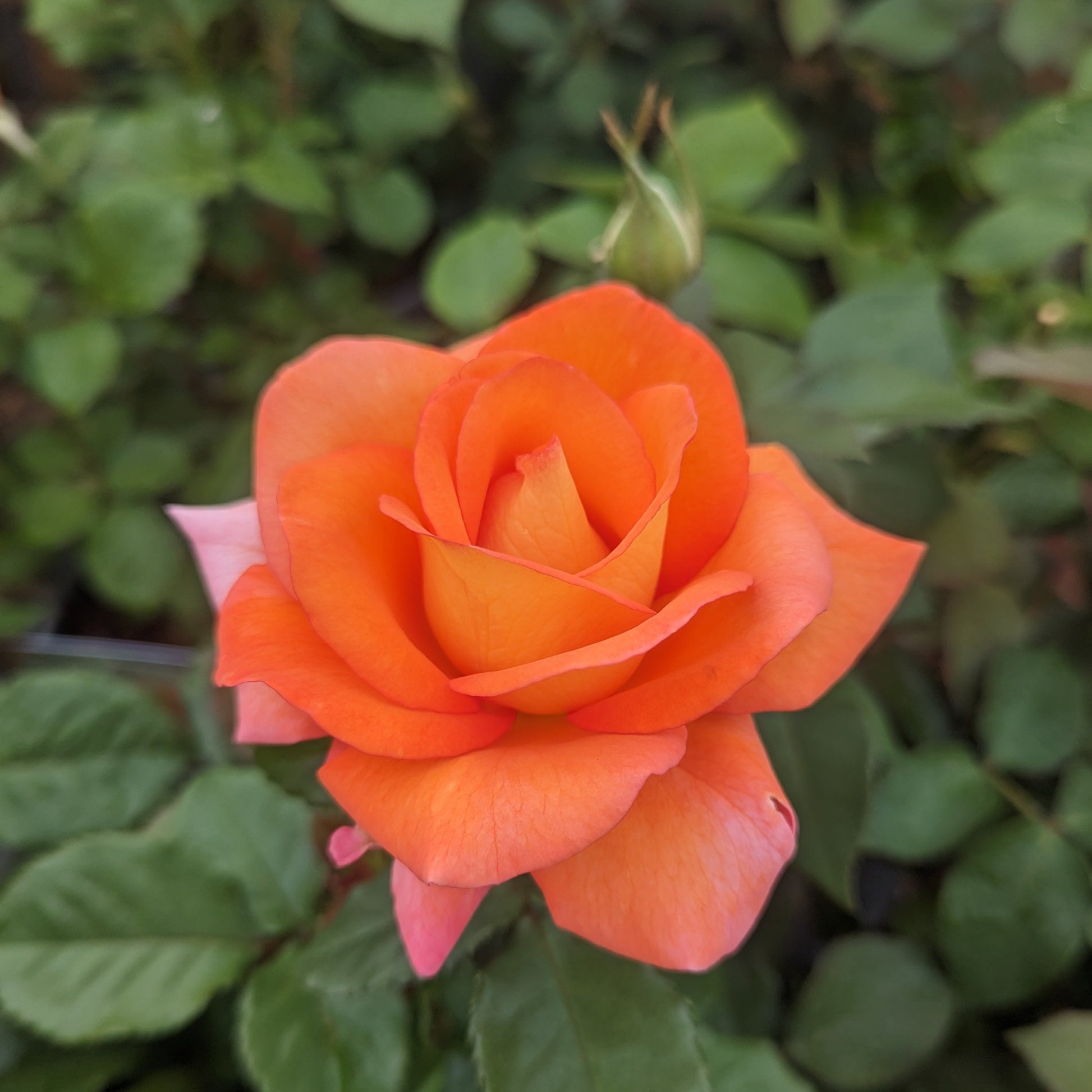 Hybrid Tea rose large orange blooms with a hint of yellow. Good fragrance. Good strong growth with a very upright habit with good disease resistance.Rose of the year in 1993.